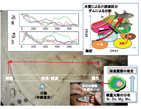 耳石とは脊椎動物の聴覚・平衡感覚器官で、主成分は炭酸カルシウムです。成長するにつれて円周状に結晶化し、円周上の「成長の跡」を残すため、魚の年齢構造や成長履歴などを追跡する良い指標とされています。回遊魚は、異なる地質構造、異なるイオンの河川や湿地で成長しますが、その履歴が耳石のCaとその他のミネラル成分(BaやSr)の存在比として十分な精度で記録されていることが裏付けられました。