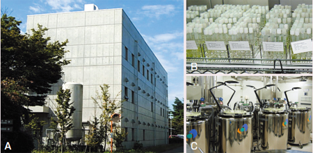 平成14年に完成した新棟(A)はRC3階建て延べ床面積1200m2、隣の旧棟はRC2階建て延べ床面積800m2です。継代培養株の保存(B)、凍結保存室の液体窒素槽(C)。