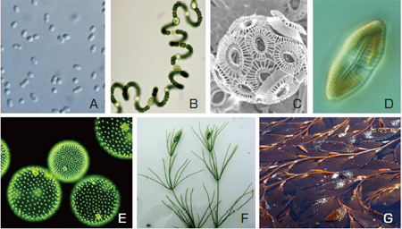 1~2μmと微小で水界の一次生産者として重要なシネココッカス(A)、窒素を固定するアナベナ(B)、直径十数μmでイオウ循環のキーとなるエミリアニア(C)、長径数十μm沿岸域の主要な生産者珪藻(D)、直径が100~数百μmに達するボルボックス(E)、藻体が10cm~1mに及ぶシャジクモの仲間(F)、世界最大の海藻で50m以上にも生長する褐藻マクロキスティス(G)。Gの写真提供:国立科学博物館北山太樹氏