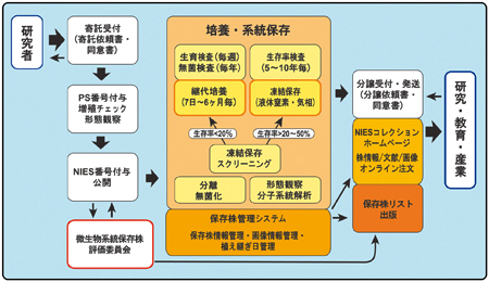 NIESコレクションでは、現在、形態的な特徴で種同定が難しいものを優先して、18S rRNA や16S rRNA遺伝子などの配列を決定して、相同性の検索や系統解析などを行っています。解析の結果、種名や所属分類群の誤りを訂正することもあります。保存株の利用者や種の同定等に広く利用できるように、随時DNAデータバンクに登録して、その登録番号を保存株情報として公開しています。分類学の進展とともに種名が変更されることがありますが、保存株番号や遺伝子登録番号は変わることのない、保存株のアイデンティティを示す情報です。コレクションの品質管理を行う上で、こうしたDNAバーコーディング情報は必須の情報と言えます。