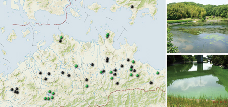 1940年代と1980年代のシャジクモ類調査報告があるため池を2004年~2011年に再調査しました。緑丸はシャジクモ類が見つかった池(18池、写真上)、黒丸は見つからなかった池(25池、写真下)。現在もシャジクモ類が生育しているため池の多くは丘陵地の小規模ため池であり、平野部の大規模ため池からは消滅したことを示しています。
