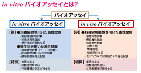 バイオアッセイは、日本語で「生物検定法」あるいは「生物評価法」と訳されています。 in vitro とは試験管内を意味し、主に培養細胞や微生物を用いた毒性試験を in vitro バイオアッセイと定義しています。 in vitro バイオアッセイは、 in vivo(インビボ) バイオアッセイに比べて安価で、試験にかかる時間は短く、例えばDNA損傷など遺伝毒性や受容体との結合活性などの作用機構を簡便に調べられる利点があります。