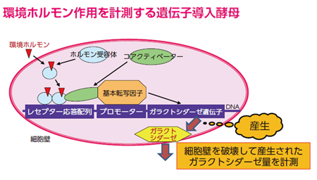 環境ホルモンを計測するために西川淳一博士らが開発したレポータージーンアッセイ用酵母の模式図です。酵母ツーハイブリッド法という遺伝子導入法でホルモン受容体とコアクチベーターの2種類のタンパク質を同時に入れることで高感度にかつ迅速にホルモンと受容体との結合活性を計測することができます。受容体結合によりレポーター遺伝子で産生されたガラクトシダーゼ量を計測して受容体結合活性値とします。