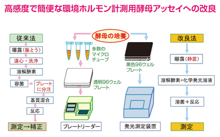 西川博士らは、ホルモン受容体結合活性を短時間に計測できる酵母ツーハイブリッド・アッセイ法を開発しましたが、その試験法(従来法)は、多数のマイクロチューブによる培養や、遠心・洗浄、プレートへの分注など操作が煩雑で、1日に数検体のアッセイしかできませんでした。私たちは、96ウェルプレートで培養と反応を行い、化学発光法による改良法を構築しました。「改良法」の導入で化学物質や環境試料を1日に100検体近くアッセイすることが可能となりました。