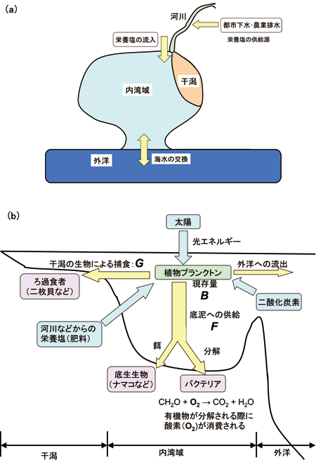 (b)内湾で生産される植物プランクトンの運命。海底に沈降する量(F)が多すぎると酸素の少ない水が底にたまる(貧酸素化)。干潟の生物が植物プランクトンをたくさん食べること(G)でFが小さくなり貧酸素化を防げる。