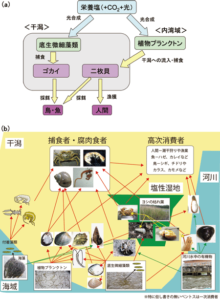 干潟には、砂泥粒子の表面に付着して繁茂する「底生微細藻類」(大きさは植物プランクトンと同程度)がたくさんいます。こうした豊富な餌を利用することで、干潟上にはゴカイなどの「堆積物食者」が高密度で生息できるようになります(図8a)。また、二枚貝などの「濾過食者」も水中の植物プランクトンを利用しながら繁殖し、干潟上に植物食性の動物が多量に生息するようになります(図8a)。こうした状況の下では、豊富なゴカイや二枚貝をめがけて鳥が押し寄せ、冒頭歌に示されたような状況が出現します。とくに、シギ・チドリなどの渡り鳥は、渡りの中継地がほぼ干潟に限られるため、彼らにとって餌の豊かな干潟は必要不可欠です。