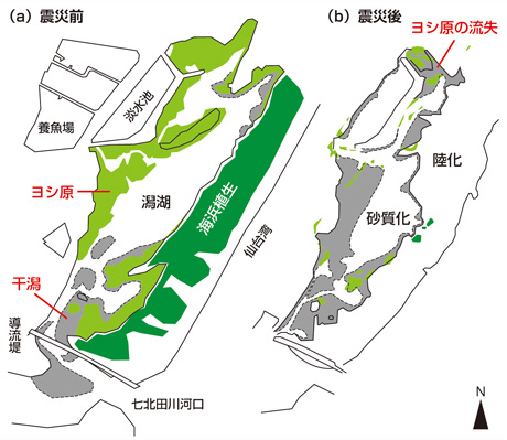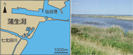 宮城県の蒲生潟は、奥行き約800m、幅約250mの汽水性潟湖です。津波により蒲生潟の海側に伸びた砂の堆積地はほぼ流失しましたが、震災後2ヵ月でふたたび砂が堆積し、6月には袋状の潟湖地形が回復しました。しかし、潟奥部海側のかつて潟湖であった一帯は砂で埋まり陸地となりました。また、潟周辺に密生していたヨシはそのほとんどが流されました。潟に生息する二枚貝やゴカイ、ヨコエビのなかには、津波のあと壊滅的な影響を受けた種類が多数みられましたが、一方で爆発的に増えた種類もありました。