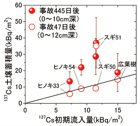 筑波山(茨城県)の森林内で、20cmの深さまでの土壌のサンプルを採取し、深さごとの放射性セシウム濃度を測定しました。放射性セシウムは、事故直後のみならず1年3ヵ月を経過した後でも表層から6cmの深さまでに全体の75~95%が存在していて、深いところへの移動は少ないことが確認されました。また、事故47日後よりも同445日後のほうが高い蓄積量が観察されました。これは、木の葉や枝から落ちてくる雨滴や、落葉・落枝に含まれるセシウムによるものと考えられます。