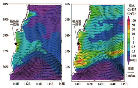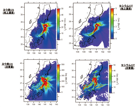 福島第一原発から放出された放射性物質ヨウ素131とセシウム137について、事故発生から約4ヵ月間の東日本太平洋沖での拡散と沈降状況のシミュレーションを行いました。関東地方に多くのホットスポットを形成した3月15~16日と3月20~23日には、大気からの沈着によって福島沖から茨城沖の沿岸域で海洋表層の放射性物質濃度がいちじるしく上昇したことが示されました。