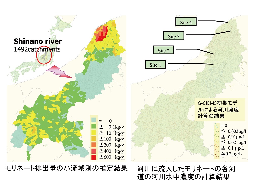 作成した河道構造を用いた最初のテストとして、河川の流下のみを扱うモデルを作成してケーススタディーを行いました。信濃川流域において、除草剤モリネートの使用量のうち河川に流入する量を簡易的に推定し、これが構築した河道ネットワークを流れて下流に向かう様子の再現を試みたものです(図9)。計算で求めた結果は、文献で報告されている河川水の観測値とおおよそ一致しており、河道流下のモデル計算が可能であることを確認しました。