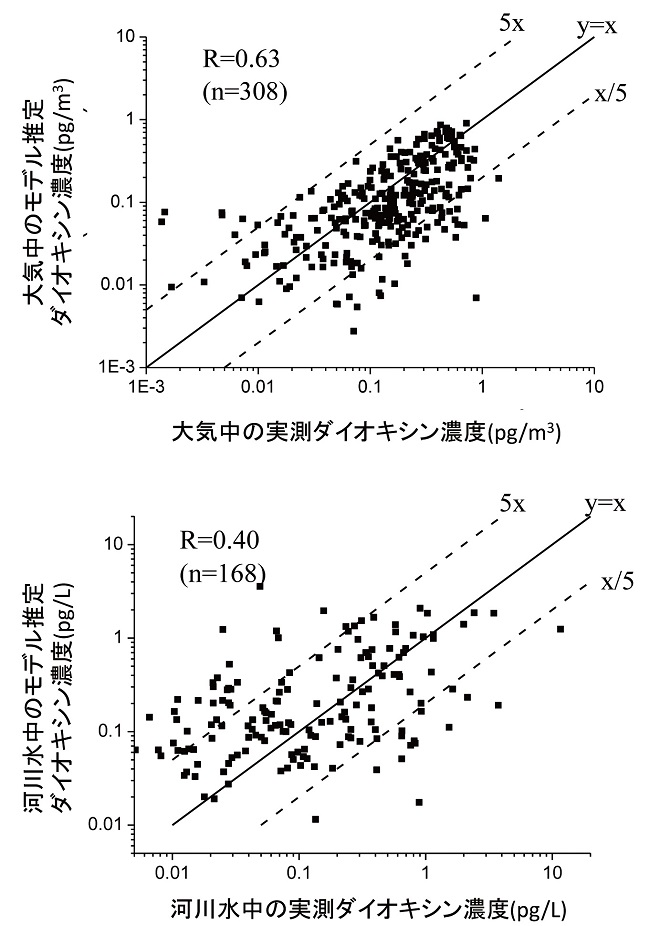 完成したモデルを用いてダイオキシン濃度の計算を行い、そのうち大気と河川水濃度についてモデル予測値と実測値の比較を行った結果を図11に示します。モデルで計算した各媒体のダイオキシン濃度の分布と実測値はおよそ1桁以内の差であるという結果が得られました。