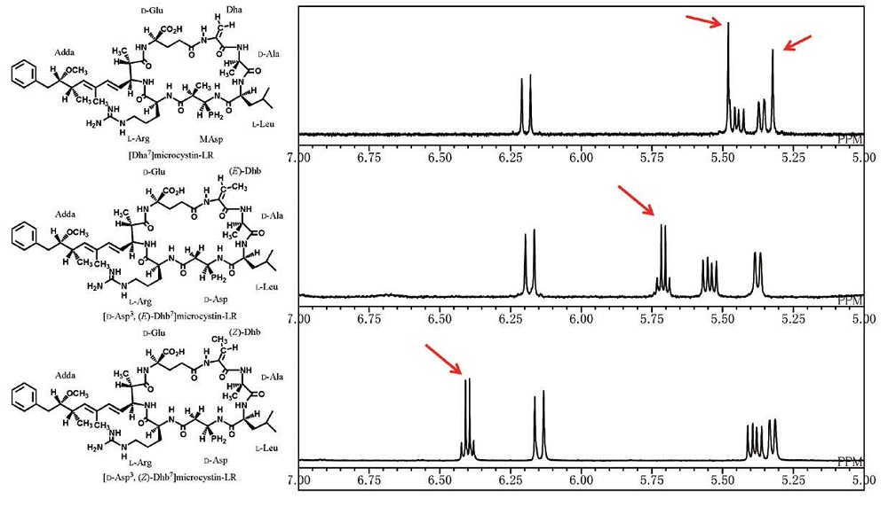 研究所でも1990年代からアオコが産生する有毒物質について研究を行っていて、一つの藍藻株について数百リットル培養しては有毒物質を抽出・精製し、構造解析をしてきました。1995年にはスコットランドの株保存施設から預かった藍藻株の中から、新しいタイプのミクロシスチン類を見つけることができ、Dhb-ミクロシスチンと命名しました(図3)。Dhb-ミクロシスチン類はNMRスペクトルでは特徴的なパターンを示しますが、当時一般的に行われていた質量分析による解析では区別が難しく、発見が遅れたものと思われます。さらに、Dhb-ミクロシスチンの中にはNMRでしか区別できない幾何異性体の同族体も存在していて、NMRによる解析が重要であることを認識させられました。また、Dhb-ミクロシスチンはグルタチオン抱合による解毒を受けにくいことが知られていて、発がん物質である可能性も指摘されています。現在までに11種類のDhb-ミクロシスチン類が報告されていますが、研究所ではそのうちの9種類についてその構造を決定・報告してきました。