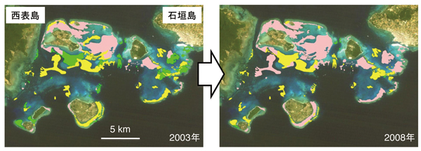 左の画像は、2003年(白化が起きる前)のサンゴの状態を、右の画像は、2008年(白化が起きた後)の状態を示しています。サンゴの状態を3つに分け、緑色の部分は健全なサンゴの比率が50-100%、黄色は5-50%、ピンク色は5%以下であることを表しています。左右を比べてみると、2003年には緑色だった部分が、2008年に黄色またはピンク色に変わり、緑色が少なくなっていることがわかります。これは、白化により、健全なサンゴが減少したことを示しています。