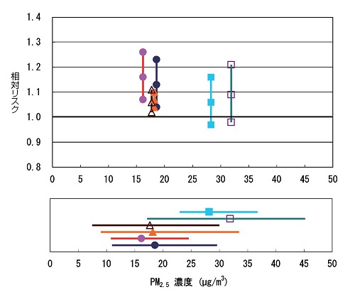 上の図は、研究対象地域の PM2.5濃度範囲の中央値(もしくは平均値 )に対する相対リスク(PM2.5 濃度 10μg/m3当たり)を示した図です。横軸は、各研究の対象地域のPM2.5濃度(μg/m3)範囲の中央値(もしくは平均値)、縦軸は相対リスクを示しています。中央のシンボルは中央値(もしくは平均値)を、バーはその95%信頼区間を示しています。