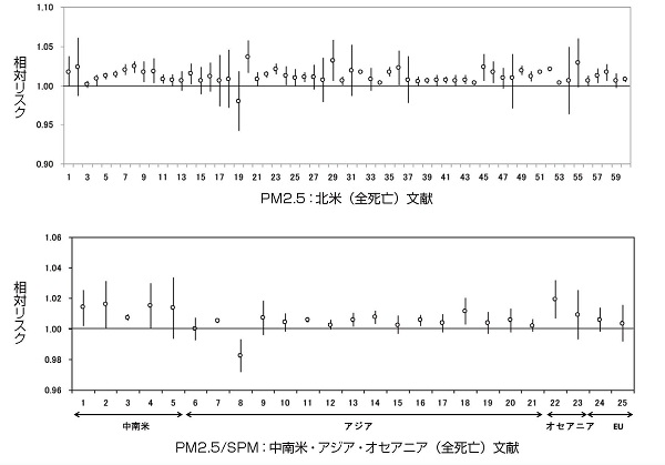 ○は PM2.5(もしくは SPM)濃度の日平均値の 10μg/m3上昇に対する相対リスクを示し、バーはその95%信頼区間を示します。横軸は各研究の番号を示します。
