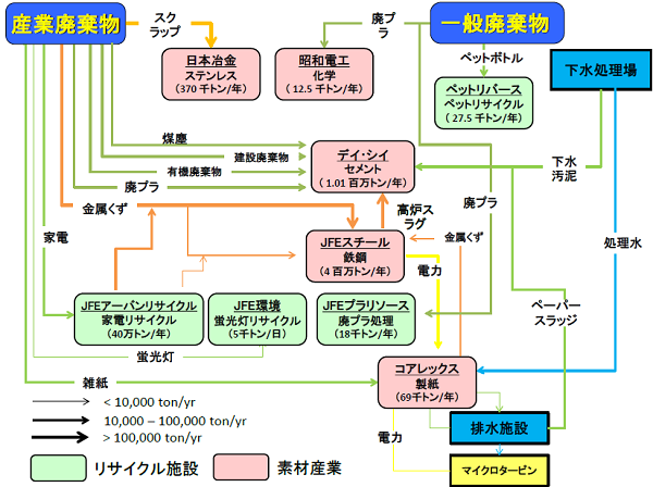 産業共生の取り組みは、海外だけでなく国内でも行われています。例えば、産業が集積している川崎市はその代表例で、物質フローの分析や、産業共生によりもたらされる効果の推計が行われてきました(図4)。これらの取り組みによって、天然資源の消費削減や、温室効果ガスである二酸化炭素の発生抑制の効果が得られています。