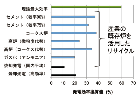 容器包装プラスチックは、多種類のプラスチックが混在し、食品による汚れなど、異物も含まれるために、理想的なリサイクルを行うのは極めて困難です。その観点では、産業の既存炉を利用したリサイクルは、最大理論効率と比較して、それほど遜色ない効率だと言えます。また、国内の廃棄物焼却発電の平均的な効率は10%を少し超える程度であり、最新鋭の高効率な焼却発電施設でも発電効率は20%程度ですので、産業の既存炉を活用したリサイクルが有利なことが分かります。