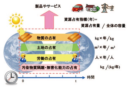 私たちは、これらの広い意味での「資源」を「占有」している状態を計測することで、持続可能性を俯瞰的に評価する指標の開発を行っています。占有とは、ある個人や集団(会社、地域、国など)が、他の人々には利用できないように独占的に利用している状態を指します。