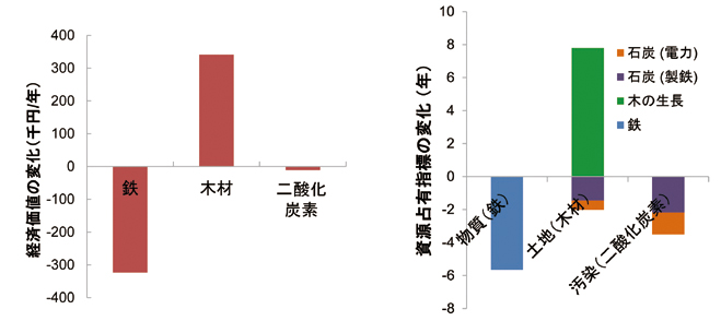 図2には、鉄骨から木造に変更した際の費用と資源占有率の変化(差)を示しており、鉄の使用、木材の使用、二酸化炭素の排出に関して、1つの評価基準である経済的な価値の変化とともに、資源占有率による評価結果(値が小さいほど持続可能)を示しています。経済的観点からは、鉄と木材は同程度の価格で、二酸化炭素削減の経済価値は、これらに比べるとずっと小さく、結果的に両者で経済的な差異はわずかであると評価されます。