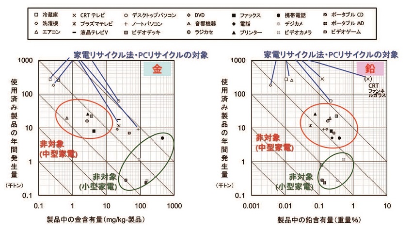 電気製品には、有害性や資源性を持つ金属が多く含まれています。有害性を持つ物質としては、鉛、カドミウムなどの金属や、ポリ臭化ジフェニルエーテル(PBDE)のような難燃剤があげられます。人体に直接有害でなくても、地球温暖化やオゾン層破壊に寄与するフロン類が含まれる製品もあります。一方、資源性を持つ金属としては、鉄、銅、アルミのほか、電子部品の中には金、銀のような貴金属があります(図4)。