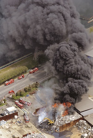 また、深刻な問題として金属スクラップからの火災の発生があげられます。港湾・船舶において、最近は年間 10件程度の金属スクラップ火災が発生しているとみています。港湾以外の陸上の金属スクラップ保管施設においても同様に火災が発生しています(図 6)。これらの火災による人的被害は幸いほとんど生じていませんが、煙害などの苦情、交通障害、停電を含む多大な影響を周辺に与えています。ほとんどの事例で出火原因が判明しておらず、また消火には数十時間も要する場合があります。そのため、金属スクラップの火災防止も重要な課題といえます。