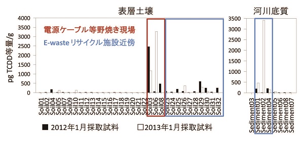使用済み電気製品の不適正なリサイクルによる健康と環境への影響については、中国とインドで多数の調査結果があります。調査から、投棄現場からの重金属の放出、解体作業からの粉じん飛散、野焼きによる有害物質や灰の発生、ハンダ除去などの加熱作業からの鉛の揮散、シアンや酸の処理排水などが問題になっています。E-wasteによる環境汚染で知られている中国広東省貴嶼(Guiyu)鎮などアジア諸国のリサイクル現場の大気、焼却灰、粉じん、土壌、水、および底質から、高濃度の鉛やダイオキシン類が検出されており、周辺地域の人々の健康と環境への被害が懸念されています。