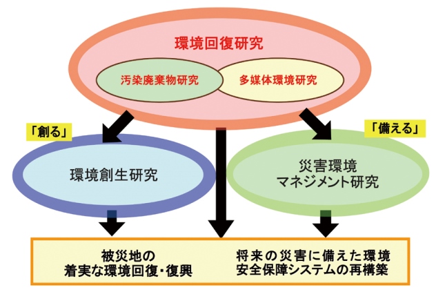 また、環境創生研究は災害後の地域環境の再生・創造等に関する調査・研究を推進しています。さらに、災害環境マネジメント研究は、将来の災害に備えた環境マネジメントシステム構築に関する調査・研究を進めています。