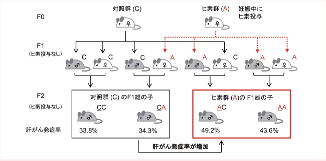 最近私たちは、妊娠中の母親(F0)に無機ヒ素を投与すると、孫の世代(F2)においても、対照群と比べて肝がんの発症率が増加することを見出しました。具体的には、ヒ素を摂取した母親から産まれたオスの子(F1)を父親とする孫世代(F2)のオスが、中年期以降に対照群と比べて肝がんを高率に発症するという結果が観察されました(図6)。この結果は、妊娠期のヒ素の摂取がF2世代まで影響をもつということを世界で初めて明らかにしたものです。