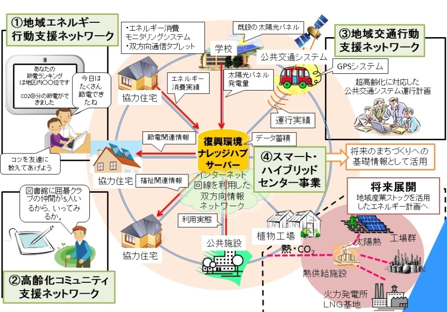 図1の「(1)地域エネルギー行動支援ネットワーク」では、エネルギー消費モニタリングシステムを住宅や公共施設、商業施設などに設置し、省エネルギーを促します。さらに、太陽光発電などの再生可能エネルギーの発電量をリアルタイムにモニタリングします。これらの情報を、「(4)スマート・ハイブリッドセンター事業」に集約して、省エネルギーとともに災害時にも強靭な分散型のエネルギーシステムを構成する地域情報ネットワークにします。このような情報システムを用いたエネルギーシステムは一般的にスマートコミュニティなどと呼ばれますが、新地町ではエネルギーだけではなく、生活や経済、環境の情報も共有するネットワークにしたいと「スマート・ハイブリッド」と名付けました。鉄道線の復旧に伴い計画されている復興まちづくり地区にこのシステムを整備し、「社会イノベーション」としての先導的な試みを福島県から発信することを目指しています。