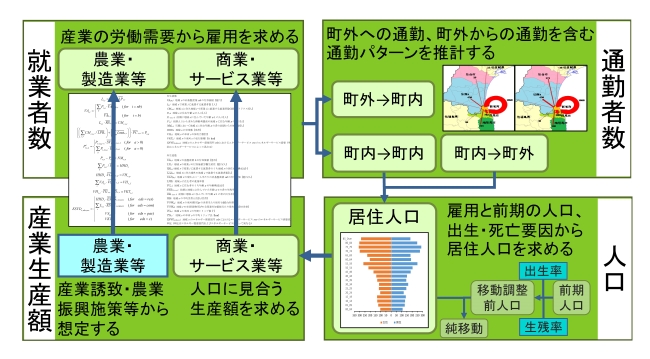 このモデルはその地域にどのような産業開発ができるかをまず考えます。福島の浜通り地域では新しい地方分散型のエネルギー施設を核にした低炭素コンビナートなどが考えられます。次にその産業に従事している人の数を算定します。これをもとに地域にどれくらいの人が住むかを推定することができます。このとき、周辺地域に通勤する人、周辺地域から通勤してくる人の割合も考えに入れます。さらに、地域に居住する人が地域内で多く買物等をすればそのぶん地域内の産業の生産が増えますから、そこで就業する人が増え、地域の人口が増え、人口が増えると消費が増え…といった効果も計算する必要があります。