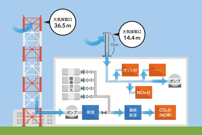 笹川:まず、モニタリングステーションの鉄塔上部に取り付けた採取口から上空の大気をポンプで引き込みます(図1)。二酸化炭素が赤外線を吸収する性質を利用したNDIRという装置で濃度を測定します。あらかじめ濃度がわかっている標準ガスを測定して、得られた出力値を基準に大気中の二酸化炭素の濃度を決めます。モニタリングステーションはつくばから遠く、人は常駐していないので、自動で連続的に分析できるようにしています。