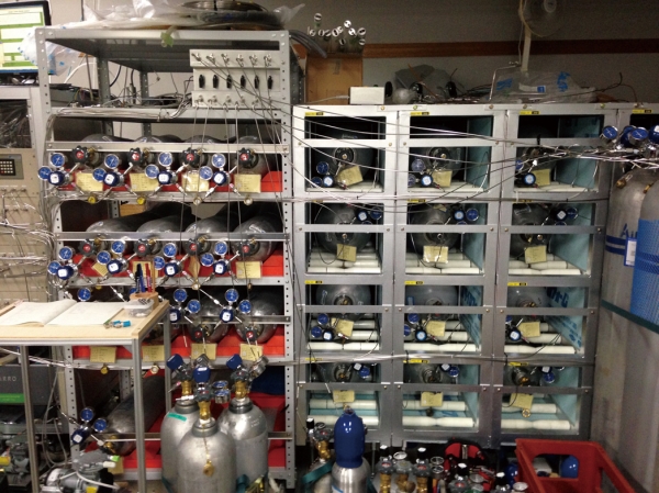 図2 二酸化炭素ガスの1次標準ガスシリーズ(左棚)と2次標準ガス(右棚)