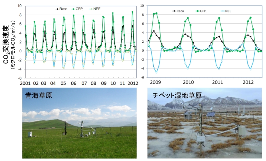 青海・チベット草原は、広くて気候環境や植物の分布が大きく異なるので、海北草原1カ所だけの観測結果を広範囲の草原に適用することはできません。そこで、衛星画像を利用して、過去15年間における青海・チベット草原全体の植物成長を調べたところ、草原全体の植物量が増えていることが示唆されました。これらのことから、青海・チベット草原は、現在も大気からCO2を正味吸収し、CO2の1つの「シンク」になっていることも言えそうです。