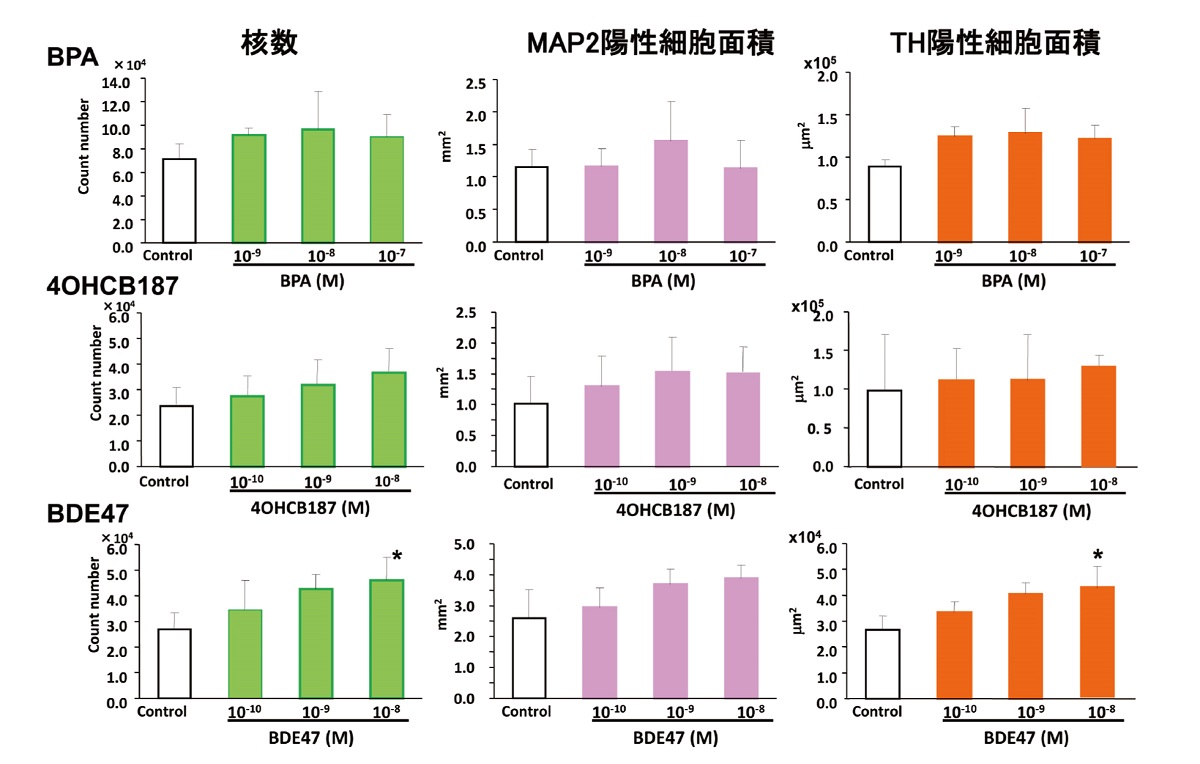 メチル水銀に対するヒトとマウスの感受性を比較した研究では、神経細胞の突起伸長に対してヒトES細胞は、マウス ES細胞よりもメチル水銀の感受性が高く、神経分化に関与する遺伝子群への影響もより強いことを明らかにしました。さらに、同様に、ヒトES細胞を用いて、ヒトで催奇形性を引き起こすことが知られているサリドマイド、疫学調査や動物実験から神経発達障害への関与が懸念されているPCB代謝物である水酸化PCB、難燃剤BDEおよびBPAの神経細胞への分化の影響を調べたところ、難燃剤BDEでは、神経突起の伸長を抑制しました(図5)。炎症や神経のシグナル伝達に関与する遺伝子群も変動していました。これらのことから、小児の神経発達に影響を及ぼす潜在的な能力があることが考えられます。