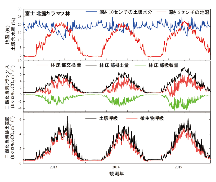 通常の年は、年間降水量が多いため乾燥しにくく、土壌水分(土壌の含水率)の変動が少ないことから、土壌水分は二酸化炭素フラックス(二酸化炭素の移動量。環境儀28号参照)の変動に与える影響が小さいことがわかりました。また、林床部の二酸化炭素収支における各プロセスの季節変動および経年変動に対して、土壌温度の影響が顕著でした。