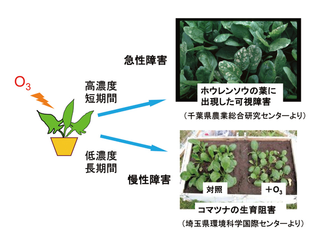 オゾンにより植物に生じる障害には、大きく2種類のものがあります(図2)。一つは急性障害と呼ばれ、敏感な植物が高濃度(たとえば0.1ppmくらい)のオゾンと短期間(2、3時間くらい)接触したときに生じ、葉に白色や褐色の病斑(可視障害)が現れます。このような部位では細胞が死滅し、クロロフィル(葉緑素)は分解されています。もう一つは慢性障害で、可視障害が生じるよりも低い濃度のオゾンと長期間(2、3日間から数カ月間)接触することで生じ、成長が遅れたり老化が進んだりします。