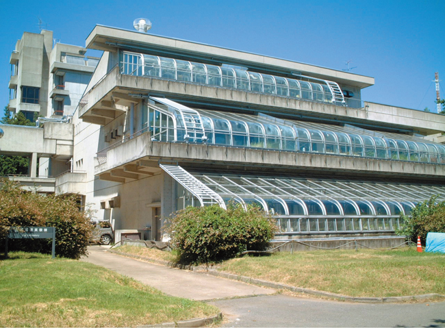 私たちの研究活動を支えるのが、大型施設である生物環境調節実験施設(通称:バイオトロン)です。実験植物を栽培するための環境制御可能な材料提供温室、環境要因と植物の反応の相互関係を研究するための処理試験室(チャンバー)、一般実験室、低温室などからなる施設で、建物南側の1、2階が材料提供温室、3階は自然光型チャンバーとなっています(図3)。チャンバーではオゾンなどの大気汚染ガス暴露や高濃度CO2処理が可能で、自然光型が4基、人工光型は大気汚染ガス暴露タイプ3基と、それより小型の乾燥・CO2暴露タイプ6基があります。オゾン暴露ができるチャンバーは国内では他に数ヵ所しかなく、1975年の建設以来、大事にメンテナンスして使っています。オゾンに対する植物の応答機構の解明に関する研究の他、マングローブ植物の環境適応機能の解明に関する研究なども行われており、私たちの研究に欠かせない施設です。