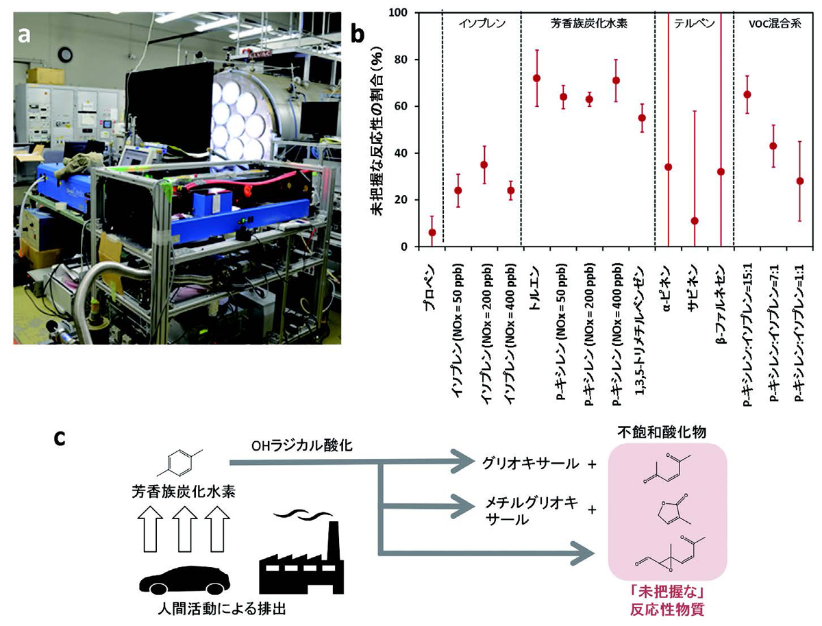 そこで、光化学反応による二次生成物の反応性を、スモッグチャンバーと反応性測定装置を組み合わせて評価しました。二次生成物の前駆物質として、プロペン、イソプレン、芳香族炭化水素類、およびテルペン類を用いました。実験の結果、芳香族炭化水素の二次生成物が重要な未把握物質であることを明らかにしました(図4b)。また、実験結果は、環境省の光化学オキシダント調査検討会での検討資料を提供している日本環境衛生センター アジア大気汚染研究センターの領域モデルに反映され、モデルで行われたオキシダント生成への影響評価を通して、行政の施策に役立てられています。
