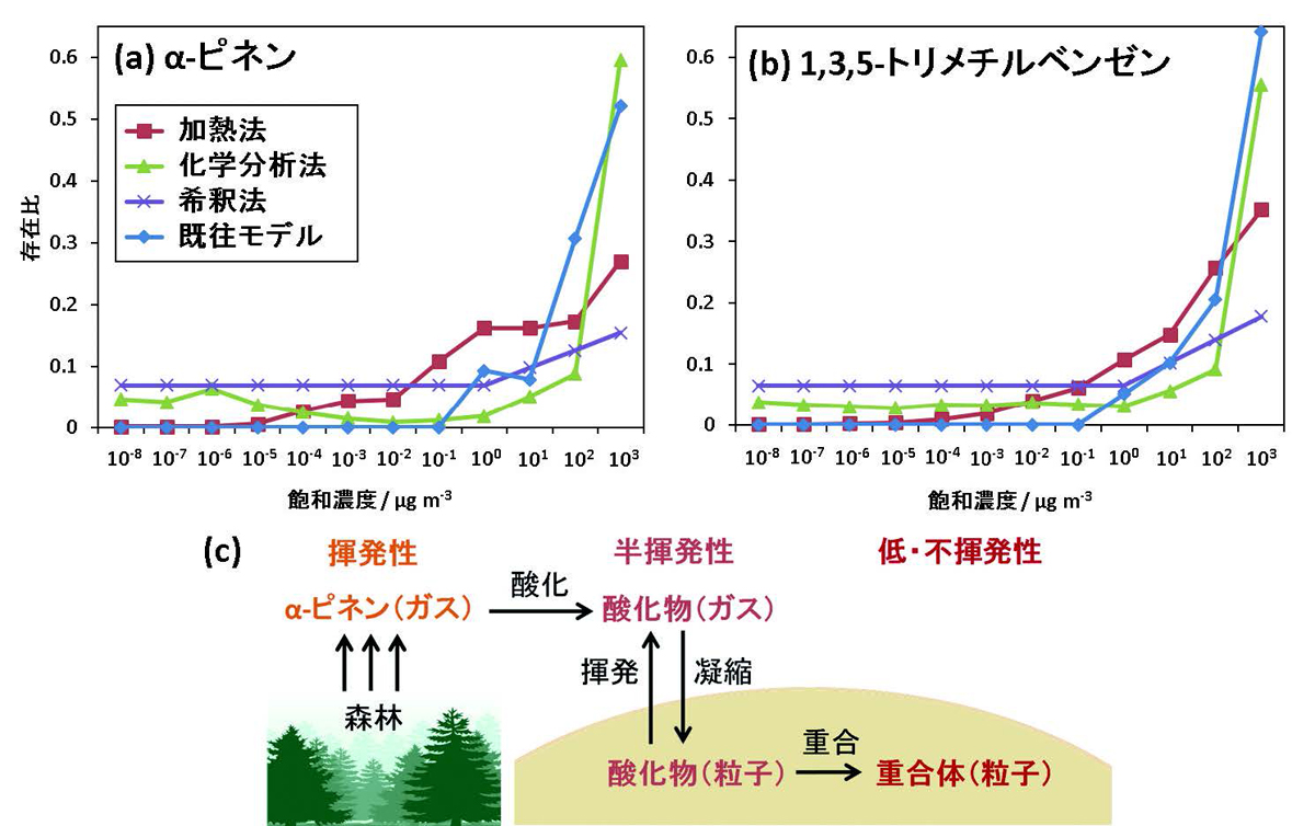 そこで、より直接的な粒子揮発性の測定として、加熱法、希釈法、および化学分析法による測定を行い、結果を相互に比較しました(図5)。モデルに採用されている分布では、10-1μg/m3以下の低揮発性物質の存在比は全てゼロとなっています。本研究の直接測定の結果にはそれぞれ固有の誤差があるものの、いずれの測定結果にも飽和濃度が10-1μg/m3以下であるような低揮揮発性の生成物が存在すると分かりました。化学分析の結果から、本研究で見つかった低揮発性の物質は酸化有機物の重合体と同定されました。重合体生成の反応を組み込んだ大気化学輸送モデルで計算した有機エアロゾル濃度と、国内各地における有機エアロゾルの観測結果を比較したところ、重合体生成の反応を組み込むことで予測の精度の改善が見られました。