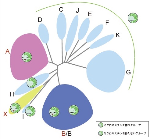 バクテリアは多くの種において、その細胞サイズが小さいために顕微鏡で属レベルでも種レベルでもその違いをかたちで見分けることは困難です。バクテリアの中でも細胞サイズが一際大きいシアノバクテリアにおいては、属レベルであれば、それなりの訓練を積めば区別可能ですが、種レベルの識別になると他のバクテリアと同様に区別することが難しくなってきます。現在では、この顕微鏡観察では区別できない違いを遺伝子解析で区別できることがわかってきています。現在まで、16S リボソームRNA遺伝子が種分類の指標とされる遺伝マーカーとして、広く利用されていますが、種レベル以下のさらに細かい違いを見るには解像度が不足していることも知られていました。しかしながら、近年、DNAの塩基配列を高速かつ大量に取得する次世代シークエンサーが広く利用されるようになったことで、16S リボソームRNA遺伝子以外の機能遺伝子についても比較的簡単に配列を取得できるようになってきました。機能遺伝子とは生命活動の維持に必要なタンパク質をコードする遺伝子などを指し、16S リボソームRNA遺伝子よりも塩基配列の変異が多い分、種レベルや種内での違いを区別することに適しています。そこで、私たちはアオコ原因シアノバクテリアの代表格であるM. aeruginosaを対象に機能遺伝子を比較することで、詳細にアオコを区別し、いつどこにどんな性質をもったMicrocystis属がいたのかを明らかにする研究を行っています。機能遺伝子の比較解析の結果、M. aeruginosaは種内で12の遺伝的に区別される系統に分けられ、その一部が肝臓毒であるミクロキスチンを作ることがわかってきました(図7)。