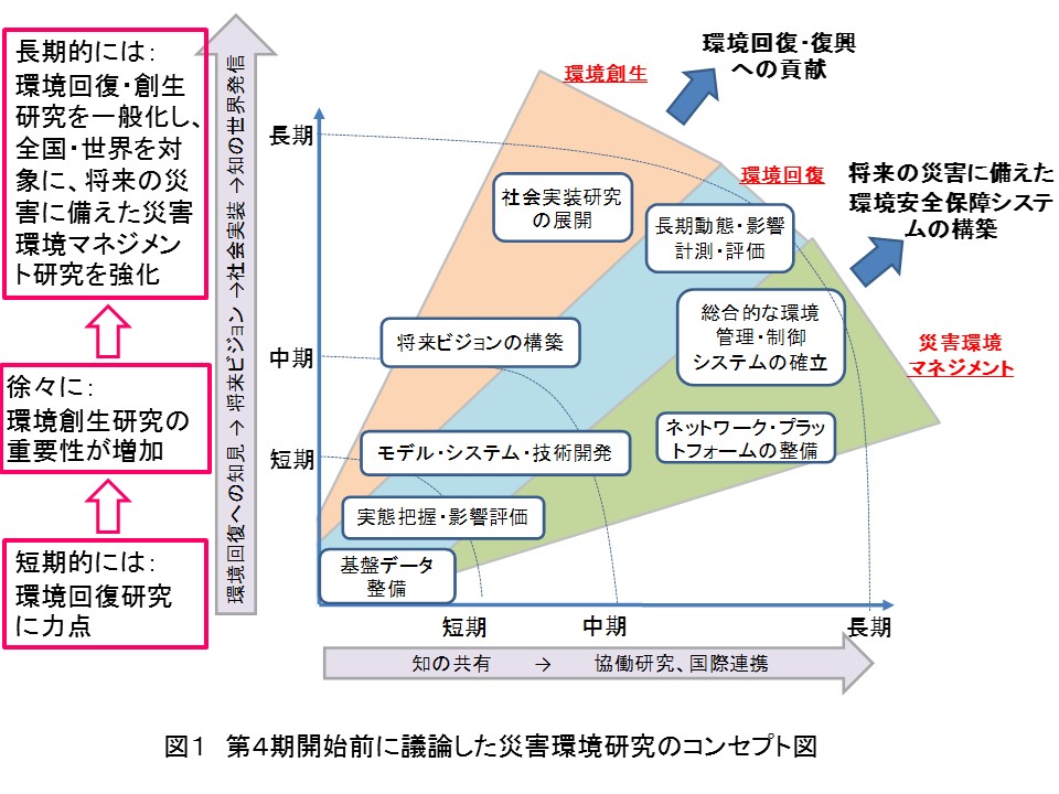 東日本大震災後に進められた国立環境研究所での多様な震災対応研究は、国の予算がついたこともあり、徐々に組織化され(環境儀No.49)、2013年3月に第3期中期目標・計画に「災害と環境に関する研究」として加筆されました。この段階では、「廃棄物」(放射能汚染廃棄物と災害廃棄物)、「多媒体環境汚染」、「環境創生」、「様々な環境変化・影響」に4区分されました。2016年度からの第4期においては、被災地のニーズを踏まえ、将来的な研究展開も見据えて、「放射能汚染廃棄物」と「多媒体環境汚染」を統合した環境回復研究、環境創生研究、並びに「災害廃棄物」と「様々な環境変化・影響」を統合した災害環境マネジメント研究の3本柱からなる災害環境研究プログラムが推進されました。第4期開始前に議論されたコンセプトを図6に示します。