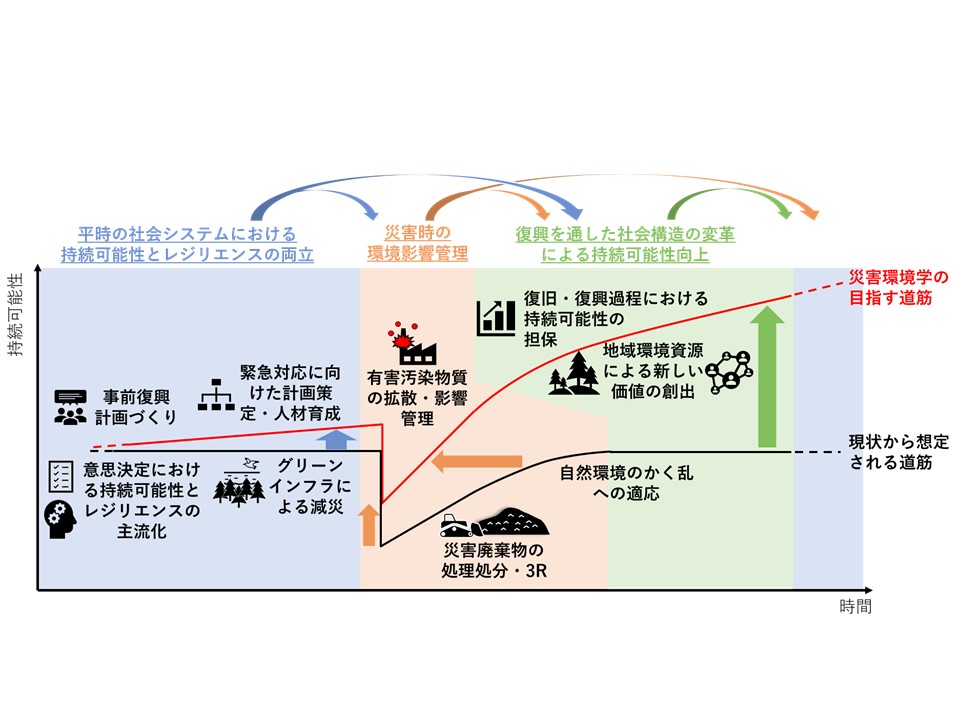 環境分野においても、被災地の自然環境・都市環境への影響やその回復と再生をテーマとした数多くの研究課題が実施されてきました。しかし、災害面からの研究においては、防災やレジリエンス(強靭性)の観点での研究は数多く実施されていますが、災害後の復興や地域づくりまでを対象としているケースは少なく、また、環境面での視点は必ずしも十分とは言えません。一方、環境面からの研究においても、災害後の汚染物質の環境影響や環境回復、災害廃棄物の処理などの調査や研究は数多く実施されているが、持続可能な地域環境を創る、環境に配慮して復興を進める、あるいは災害に強靭な地域を創るといった、被災地の中長期的な取り組みに貢献する研究はほとんどありません。さらには、平時から社会の持続可能性を高めつつレジリエンスを向上させることで災害時における環境影響の緩和や適正管理を実現するとともに、災害復興をきっかけとしてさらに持続可能性の向上を目指す一連のプロセスを対象とするような体系的な研究は見当たりません。