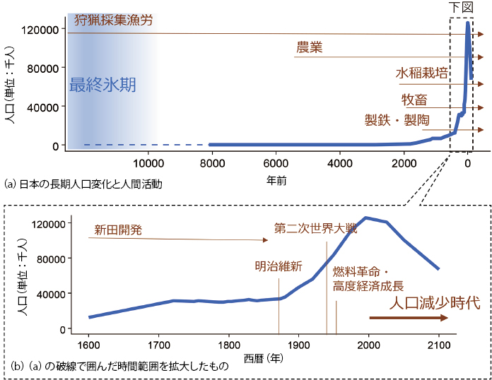 歴史人口学の研究によれば、日本の人口はいくつかの停滞期があったものの、これまでほぼ単調に増加してきました。その背景には、資源利用の形態の多様化や、土木技術の向上に伴う開墾の広がりがあったと考えられます。明治維新以降は近代化や経済のグローバル化、燃料革命に伴い人口が急増しましたが、2008年には少子高齢化により日本の総人口が減少に転じました。国立社会保障・人口問題研究所の推計値では、2050年には日本の総人口は1億人を下回り、さらに2100年には5000万人を下回ると考えられています(図1)。そのような急速な人口減少は日本の歴史上例がありません。