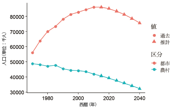 さらに、農村から都市への人口流入による人口分布の偏りが同時に生じています。1970年には農村人口と都市人口の比率は同程度でしたが、2020年現在では都市人口と農村人口の比率が2倍程度に広がっており、その傾向は今後も続くと考えられています(図2)。そのような人口減少と人口集中が同時に生じた結果、2050年には現在の居住地域の2割が無居住化すると予測されています。