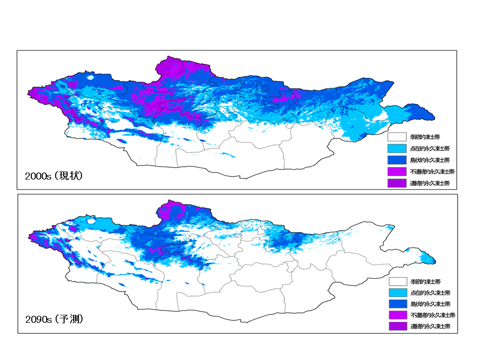 広域の永久凍土の将来予測を行うため、私たちは、NASAの地球観測衛星Terra/Aquaに搭載されているMODIS(中分解能撮像分光放射計)による地表面温度データ(MOD11A2)を用いて、従来の気象観測による数十kmメッシュより遥かに精度の高い1kmメッシュの永久凍土の現状分布図を作成しました。さらに、気候変動に関する政府間パネル(IPCC)第5次評価報告書(AR5)に参加した5つの全球気候モデル(MIROC-ESM、NCAR-CCSM4、NOAA-GFDL-CM3、BCC-CSM1.1およびMPI-M-ECHAM6)のうち、現地観測データと最も相関の高いMPI-M-ECHAM6の予測結果(RCP8.5)を用いて、今世紀末(2090年代)の永久凍土分布のシナリオ予測図も作成しました。それによると、今世紀末までにモンゴル北部の海抜の高い山地以外では、永久凍土は連続・不連続的にしか残存せず、特に、点在的・島状的な永久凍土地域の面積は現在の1/5程度に縮小すると予想されました(図2)。さらに、気候変動と人為的な攪乱が凍土融解に与える影響を解明するために、私たちは、SHAW(Simultaneous Heat And Water)モデルを用いて数値実験を行いました。その結果から、気温上昇や降水量の減少による干ばつは、さらに地表面温度の上昇に拍車をかけ、永久凍土融解の一要因になると考えられました。また、干ばつと過放牧が温暖化と同時に起これば、永久凍土の融解をさらに加速させる可能性も示唆されました。