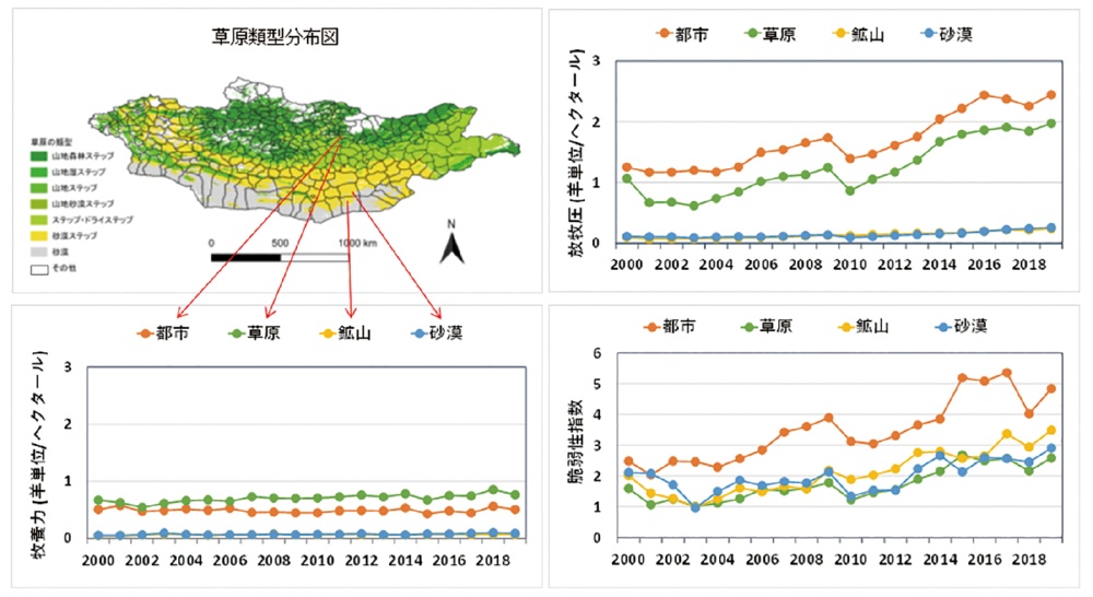 気候変動に加え、人為的攪乱が草原生態系に及ぼす影響を評価するため、私たちは、水や飼料の需給バランスを考慮した牧草地の牧養力および脆弱性を評価する統合モデルを開発しました。入力データとして、モンゴル全土の地形や土地利用データ(解像度30m)、MODIS植生指数や葉面積データ(解像度1km)、そして欧州中期予報センター(ECMWF)モデルによる気温、湿度、風速、降水量、放射収支などの気象再解析データが利用されました。また、都市化や過放牧など人為的攪乱を表す指標(放牧圧)を推計するため、2000〜2019年の市町村別の人口、産業、家畜頭数(牛、馬、羊、ヤギ、ラクダなど)のデータを入手し、地理情報システム(GIS)を用いて解析しました。