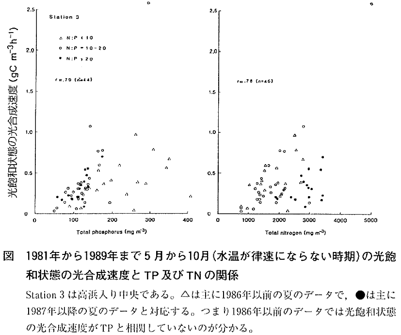 変化の前後9年のデータを眺めて見ると、夏の植物プランクトン種の変化は湖水の夏のTN(全窒素量)/TP(全リン量)比の変化と対応することが分かった。つまり、ミクロキスティスが大発生した1986年以前では夏のTN/TP比の最小値は5.0-8.0であったのに、1987年以降は 16.0-17.1となった。さらに、5月から10月までの、光強度が律速しない植物プランクトンの光合成速度は1986年以前は窒素制限であったにもかかわらず、1987年以降はリン制限へ変化していることが分かった(図)。海老瀬氏によると霞ヶ浦流域からの窒素リンの負荷量は雨量に依存するが、晴天時では近年無リン洗剤の普及などでリンの流入負荷が横ばい、もしくはわずかばかり減少しているが窒素の負荷は年々増えているということである。おそらくこれが反映されて、さらに、夏期の植物プランクトン種が変わったために(おそらくユレモはミクロキスティスほど底泥のリンを持ち上げる能力がないのではないかと考えている)、湖水中のTPが減少しTNは増加し、結果的にTN/TP比が上がったと考えられる。