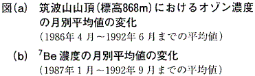 従来からオゾンはスプリングリークにより成層圏から降下してくることで、北半球中緯度地域では春季に地表付近の濃度が高くなり、年平均値の1.5倍ないし2倍になることは知られているが、秋季にも高くなることがこの観測で認められた。また、この季節変化は春季と秋季にピークを持つ中緯度地域における7Be濃度の季節変化とよく一致している。