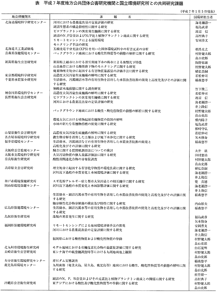 平成7年度地方公共団体公害研究機関と国立環境研究所との共同研究課題について