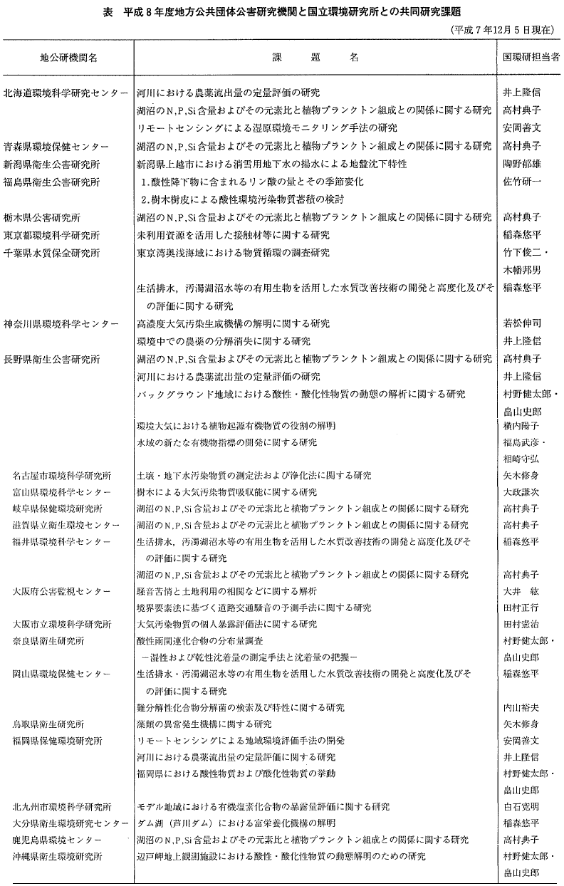平成8年度地方公共団体公害研究機関と国立環境研究所との共同研究課題について